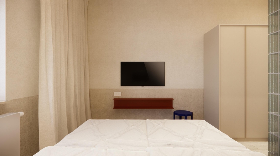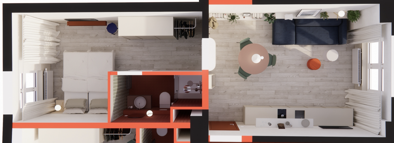 Designed like a compact one-bedroom flat, it features a private bedroom and a living room with an integrated kitchen. Young professionals will appreciate the dedicated workspace with a desk as well as a cozy sofa corner for relaxation.